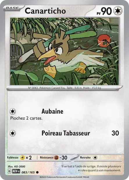 Ajoutez à votre collection Canarticho 83/165 en version Reverse Holo, le Pokémon de type Normal emblématique connu pour son célèbre poireau.