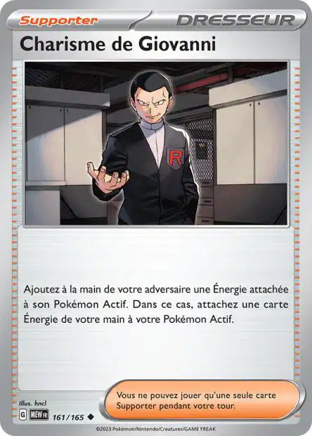 Ajoutez à votre collection Charisme de Giovanni 161/165 en version Reverse Holo, issu de la série 151 consacrée aux Pokémon iconiques de Kanto.